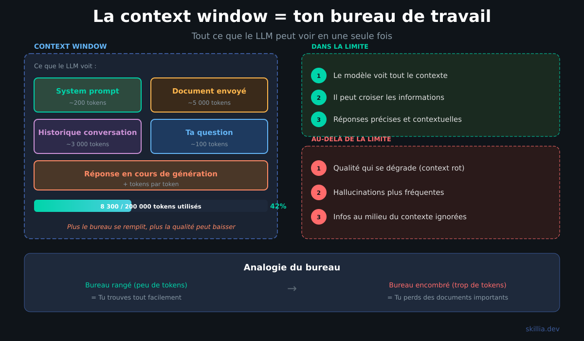 Un LLM, c'est pareil. Sa context window, c'est son bureau. Tout ce qui rentre sur le bureau, il peut le voir et l'utiliser. Ce qui ne rentre pas, il ne le connaît pas.