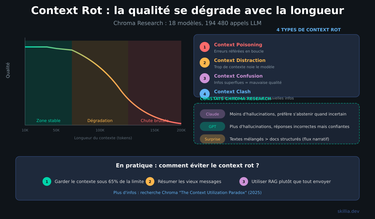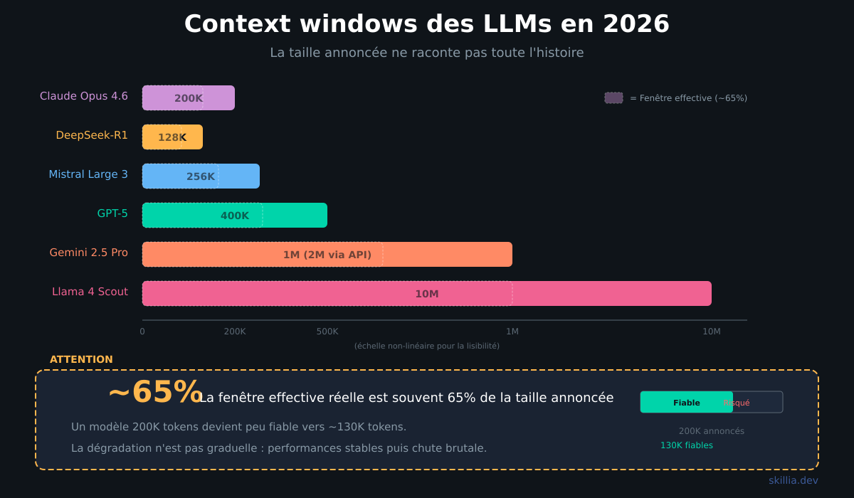 Fenêtre annoncée ≠ fenêtre effective. Un modèle qui annonce 200K tokens devient généralement peu fiable autour de 130K tokens (65% de l'annonce). La dégradation n'est pas graduelle : le modèle maintient de bonnes performances puis chute brutalement à un seuil.