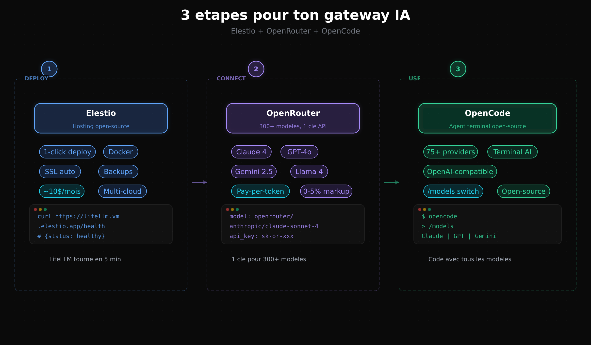 Maintenant que LiteLLM tourne sur Elestio, on le connecte à OpenRouter pour accéder à 300+ modèles.