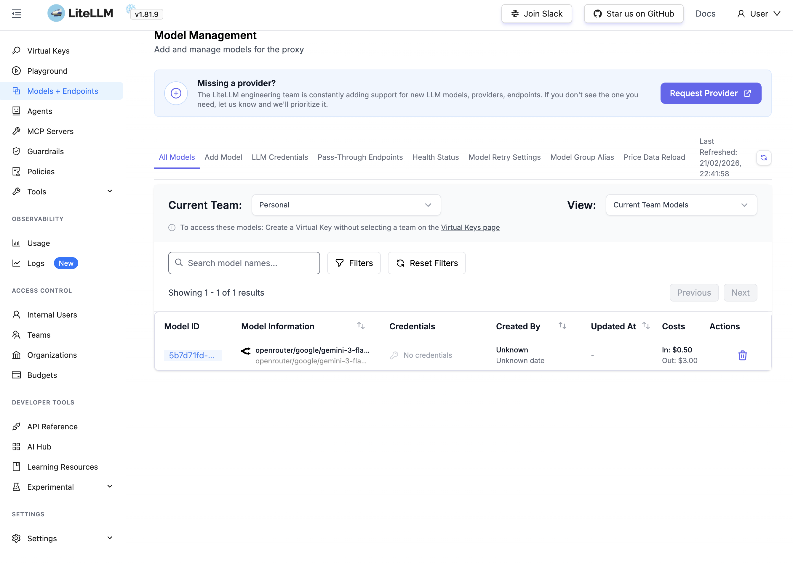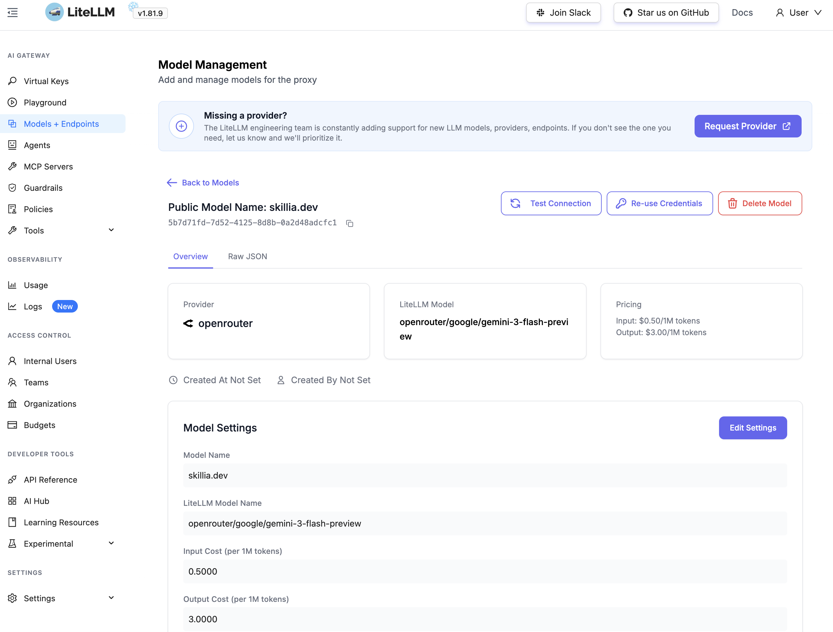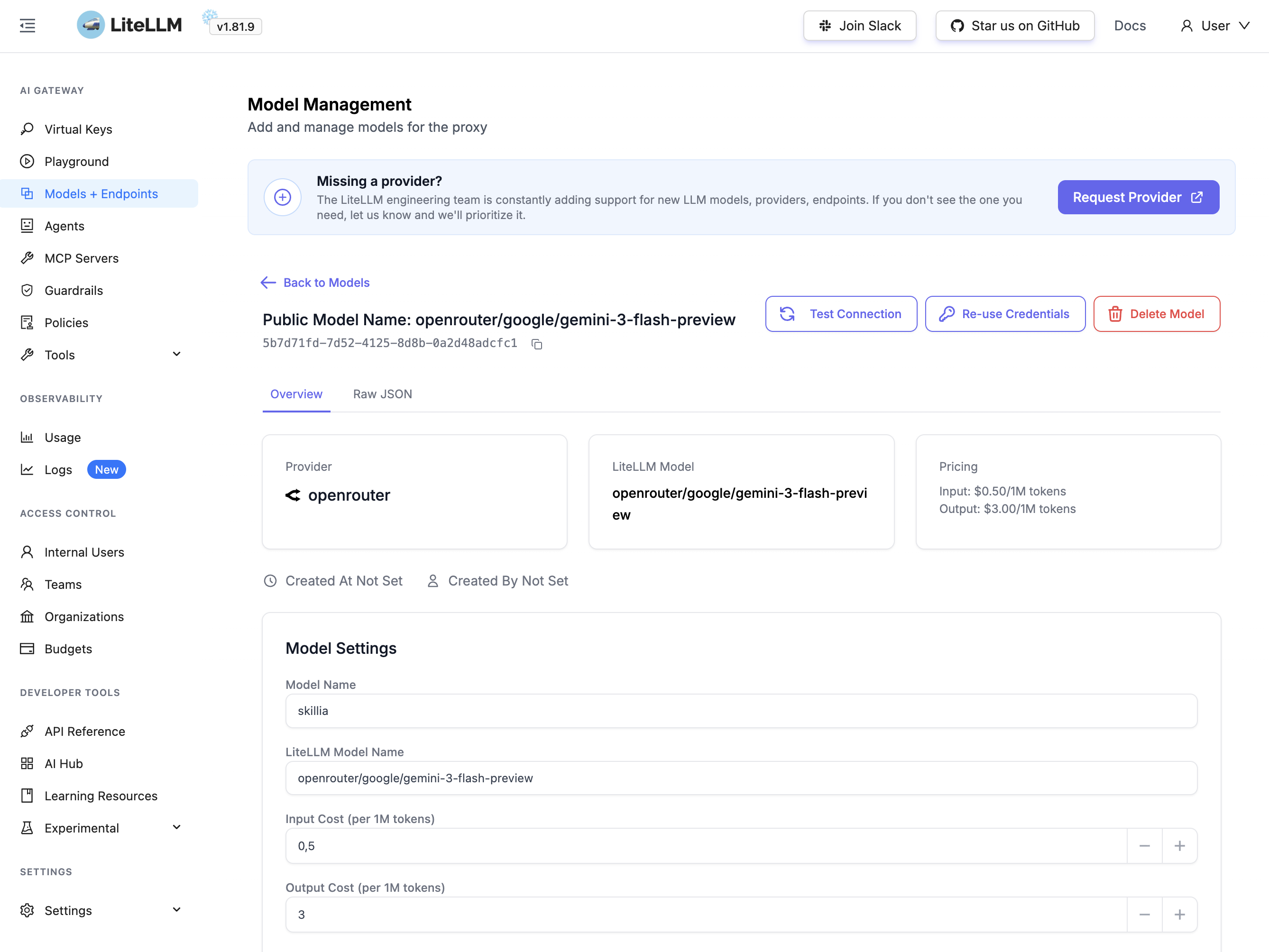Va dans Models + Endpoints → Add Model. Le format LiteLLM pour OpenRouter est openrouter/<provider>/<modele>. Par exemple, pour Gemini 3 Flash :