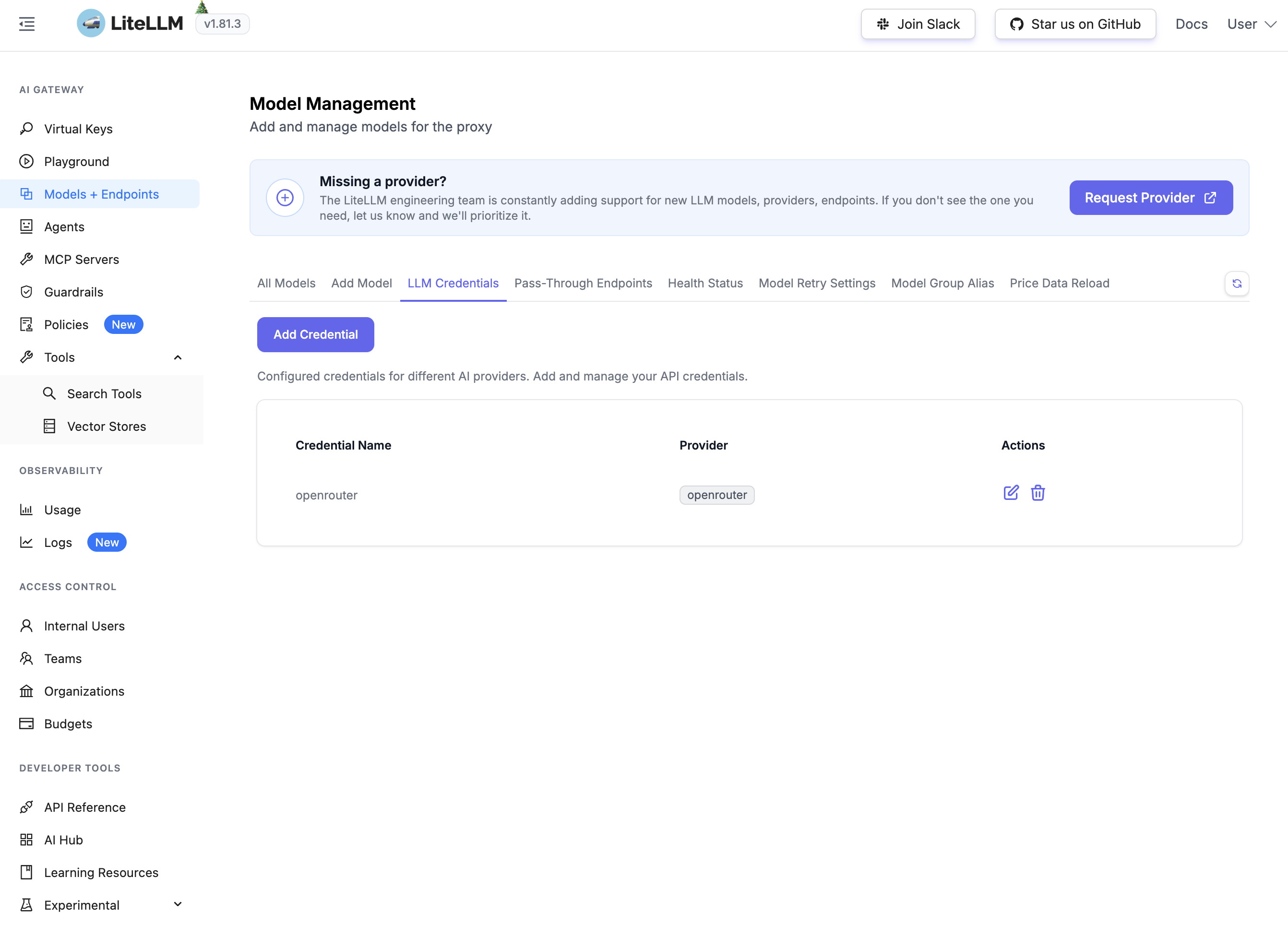 Va dans Models + Endpoints → LLM Credentials → Add Credential. Choisis "openrouter" comme provider et colle ta clé API.